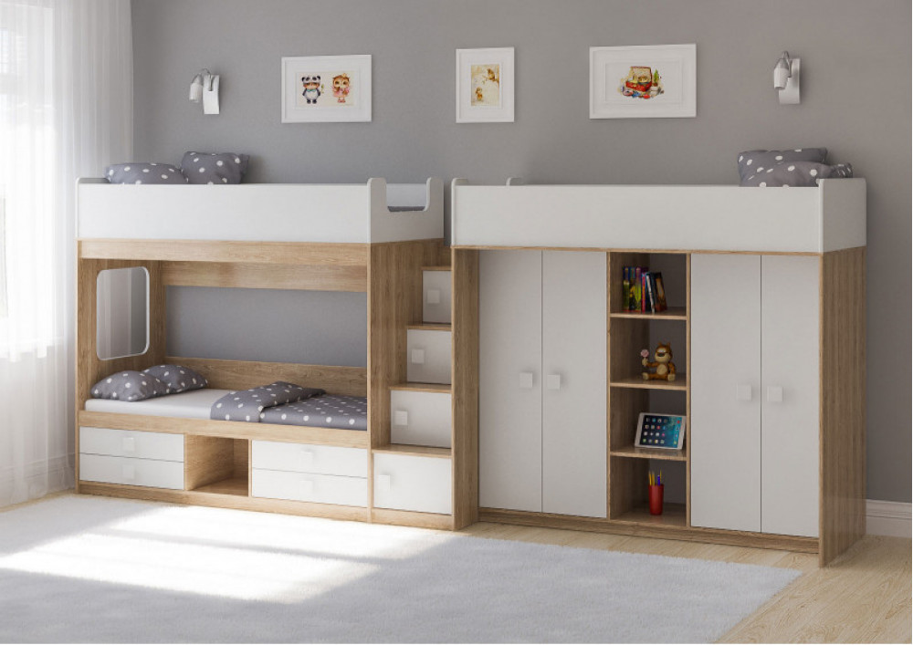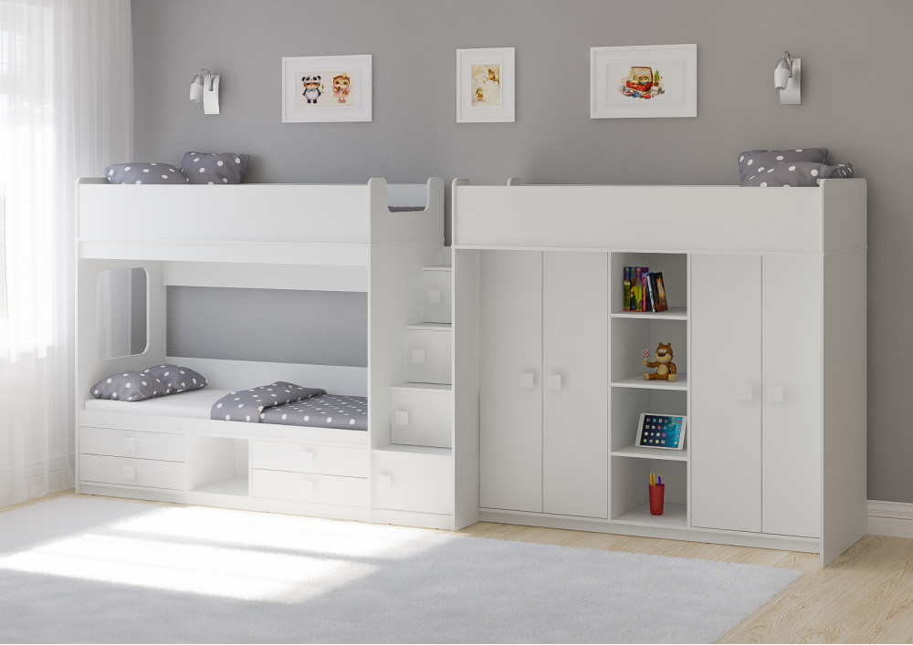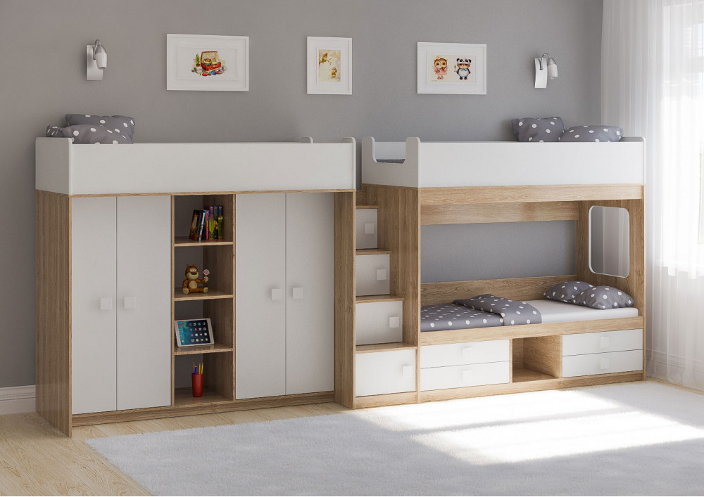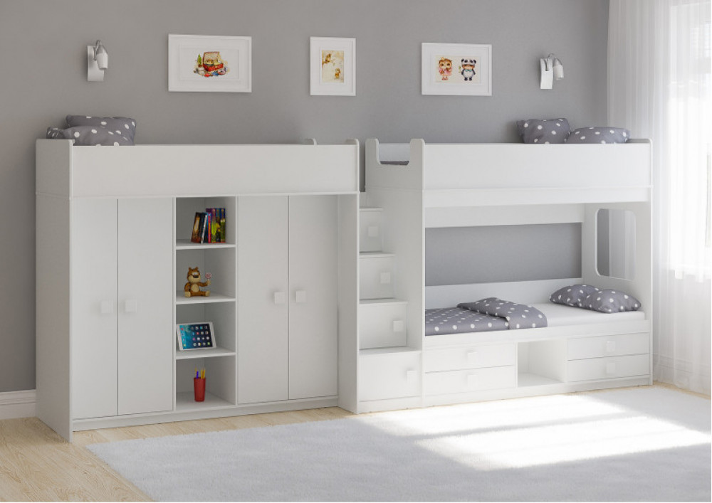 Две кровати, два шкафа, 4 выдвижных ящика – одна лестница.